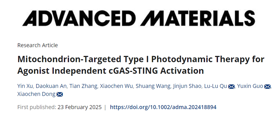 近日,我校董曉臣教授團隊在“癌癥光免疫治療”領域取得了重要進展,該成果以江蘇師范大學為第一通訊單位發表在國際知名期刊Advanced Materials上,題為“Mitochondrian-Targeted Type I PhotodynamicTherapy for Agonist Independent cGAS-STING Activation(線粒體靶向I型光動力療法用于非激動劑依賴的cGAS-STING通路激活)”。我校化學與材料科學學院碩士研究生徐銀為論文的第一作者,董曉臣教授、郭育新副教授以及渠陸陸教授為共同通訊作者。該論文受到了國家自然科學基金等項目的資助。
