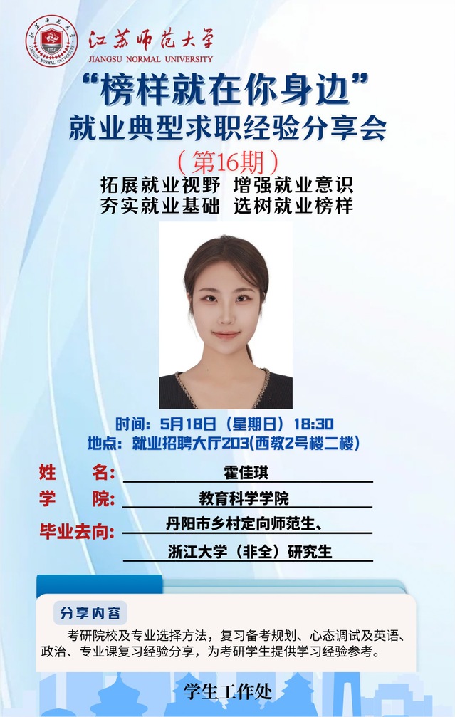 為增強學生就業意識,拓寬就業視野,夯實就業基礎,學生工作處結合學生關注度高、求職意愿強烈的行業領域,開展“榜樣就在你身邊”2025屆畢業生就業典型求職經驗分享系列活動,充分發揮朋輩榜樣的示范引領作用,幫助更多的學生提升就業競爭力。經學院推薦、學校遴選,現將第十六期活動開展相關情況通知如下: