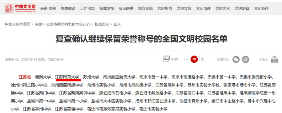 2017年,我校獲評首屆“全國文明校園”稱號,2020年、2025年蟬聯該項榮譽。站在新起點,學校將以更加飽滿的熱情、更加務實的作風、更加創新的思維,不斷擦亮“全國文明校園”金字招牌,推動校園文明建設向更高層次邁進,為全面建設高水平大學而不懈奮斗。