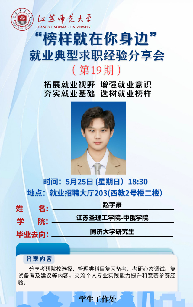 為增強(qiáng)學(xué)生就業(yè)意識(shí),拓寬就業(yè)視野,夯實(shí)就業(yè)基礎(chǔ),學(xué)生工作處結(jié)合學(xué)生關(guān)注度高、求職意愿強(qiáng)烈的行業(yè)領(lǐng)域,開展“榜樣就在你身邊”2025屆畢業(yè)生就業(yè)典型求職經(jīng)驗(yàn)分享系列活動(dòng),充分發(fā)揮朋輩榜樣的示范引領(lǐng)作用,幫助更多的學(xué)生提升就業(yè)競(jìng)爭(zhēng)力。經(jīng)學(xué)院推薦、學(xué)校遴選,現(xiàn)將第十九期活動(dòng)開展相關(guān)情況通知如下: