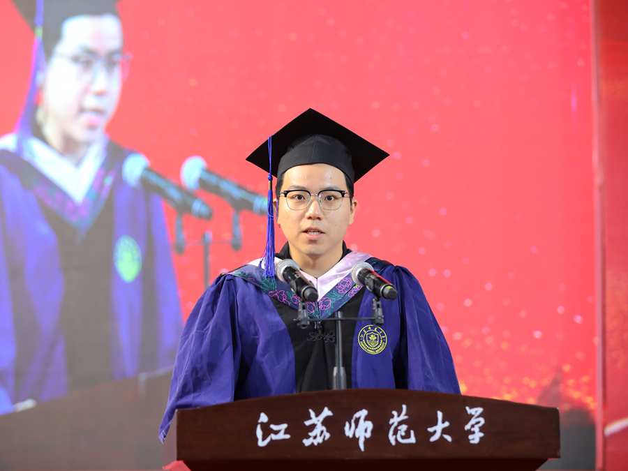 馬克思主義學院焦天震作為畢業(yè)研究生代表發(fā)言,并分享了三點感悟。一是要以信仰為炬,照亮真理的求索之路;二是要以篤實為犁,深耕學術的豐沃原野;三是要以夢想為帆,奔赴強國的廣闊天地。他號召全體畢業(yè)研究生永遠保持“敢教日月?lián)Q新天”的信念、“板凳要坐十年冷”的堅守、“直掛云帆濟滄海”的勇氣,在各自領域書寫江蘇師大人的青春答卷。
