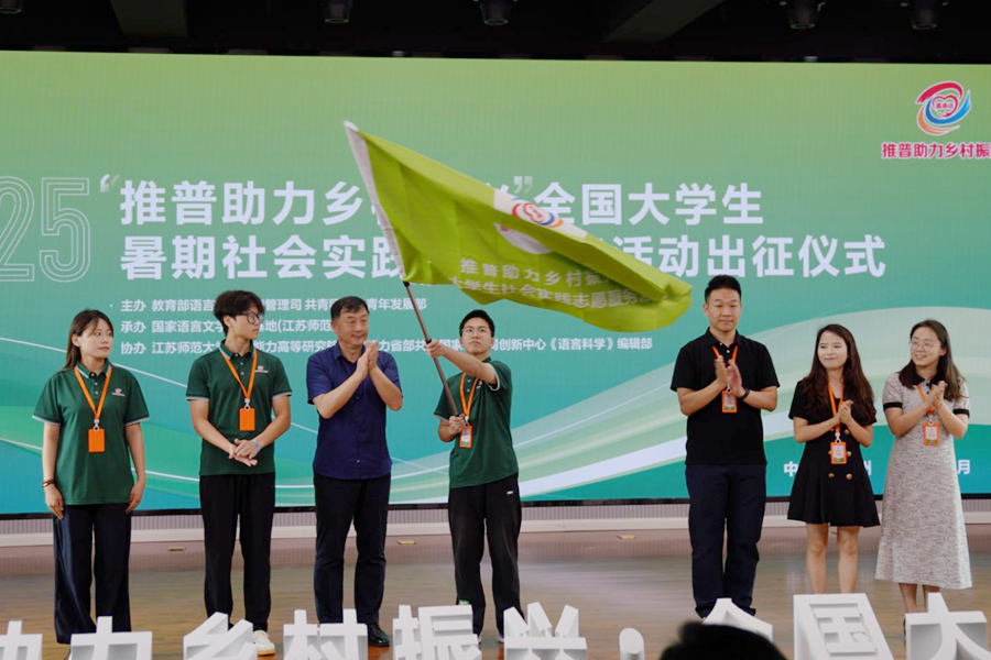 日前,由教育部語言文字應用管理司、共青團中央青年發展部共同主辦的2025年“推普助力鄉村振興”全國大學生暑期社會實踐志愿服務活動出征儀式在我校舉行。教育部語言文字應用管理司副司長王暉,江蘇省教育廳語言文字與教材工作處處長沈曉冬,江蘇師范大學校長杜增吉,國家語言文字推廣基地(江蘇師范大學)主任、教育部長江學者特聘教授楊亦鳴出席出征儀式。來自全國948所高校的2000支團隊、21000余名大學生志愿者通過線上線下方式共同參與出征儀式。