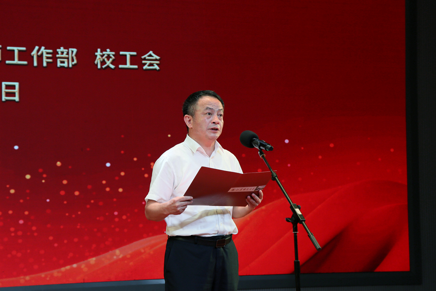 校黨委書記芮國(guó)強(qiáng)在表彰大會(huì)上講話,代表校黨委向辛勤耕耘在教學(xué)、科研、管理、服務(wù)一線的全體教職員工和離退休教師致以節(jié)日的問(wèn)候和崇高的敬意,向新入職的教師表示熱烈的歡迎,向受到表彰的先進(jìn)集體和優(yōu)秀個(gè)人表示衷心的祝賀。芮國(guó)強(qiáng)指出,過(guò)去的一年,全體教職員工深入學(xué)習(xí)貫徹習(xí)近平總書記關(guān)于教育的重要論述,深入推進(jìn)“一融雙高”,聚力推進(jìn)“改革、拓展、轉(zhuǎn)型、提檔”,各項(xiàng)事業(yè)取得顯著成效。站在新的起點(diǎn),我們要體悟教育家精神,鑄牢強(qiáng)師之魂。要踐行教育家精神,扛起強(qiáng)國(guó)之責(zé)。要弘揚(yáng)教育家精神,貢獻(xiàn)發(fā)展之力。要以教育家精神為引領(lǐng),以先進(jìn)典型為榜樣,以昂揚(yáng)的斗志、務(wù)實(shí)的作風(fēng)、創(chuàng)新的精神,奮力推進(jìn)學(xué)校高水平大學(xué)建設(shè),在教育強(qiáng)國(guó)建設(shè)的偉大實(shí)踐中書寫師大新華章。
