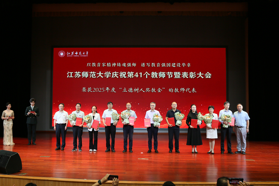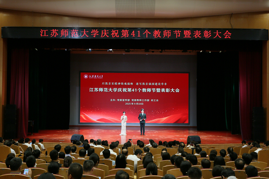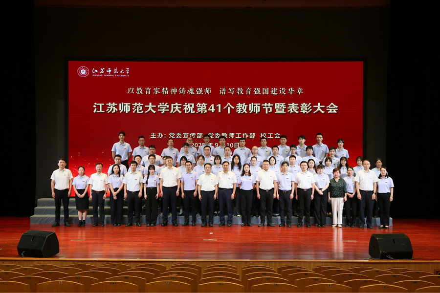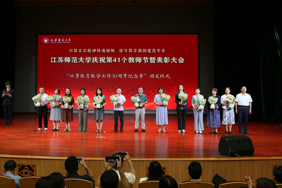 9月10日下午,江蘇師范大學(xué)舉辦“以教育家精神鑄魂強(qiáng)師,譜寫教育強(qiáng)國(guó)建設(shè)華章”為主題的慶祝第41個(gè)教師節(jié)暨表彰大會(huì)。在校全體校領(lǐng)導(dǎo)、江蘇省教育基金會(huì)副秘書長(zhǎng)張虎成、各學(xué)院黨政負(fù)責(zé)人、機(jī)關(guān)部門和直屬單位主要負(fù)責(zé)人、教師代表、接受表彰的先進(jìn)集體和個(gè)人代表、從事教育教學(xué)30周年教師代表、退休教師代表、新入職教師和學(xué)生代表參加表彰大會(huì)。