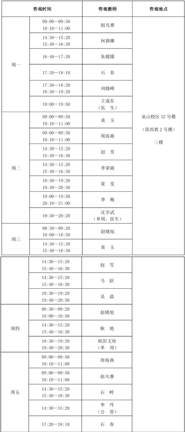 2.[第2周起]面對面心理咨詢與功能室預約時間:周一至周五8:00—12:00、14:00—17:00、18:00—20:00;