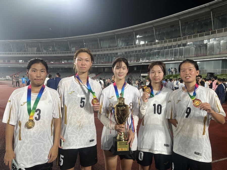 受中國駐孟加拉國大使館邀請,我校女足隊(duì)員近日赴孟加拉國參加“慶祝中孟建交50周年”中孟女足友誼賽。當(dāng)?shù)貢r(shí)間9月20日,孟加拉國家體育場燈火輝煌,以我校5名女子足球運(yùn)動員梁欣怡、張智佳、嚴(yán)雨晨、程子彤和蔣紫夷為主力的中國大學(xué)生聯(lián)隊(duì),展現(xiàn)了出色的戰(zhàn)術(shù)水平和良好的體育風(fēng)貌。整場比賽精彩紛呈,3粒進(jìn)球均由我校學(xué)生完成,最終以3:0戰(zhàn)勝孟加拉國U17女子足球國家隊(duì),贏得了比賽勝利。