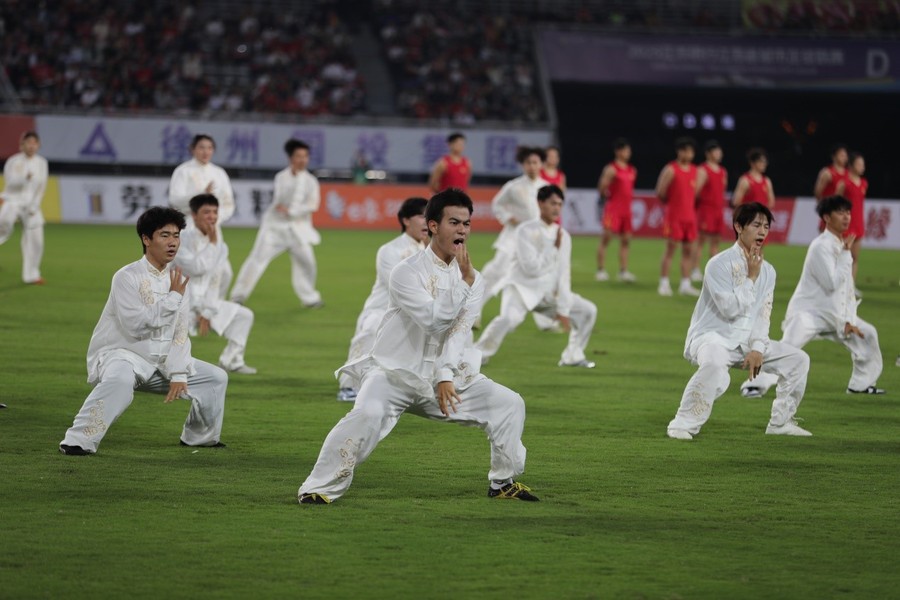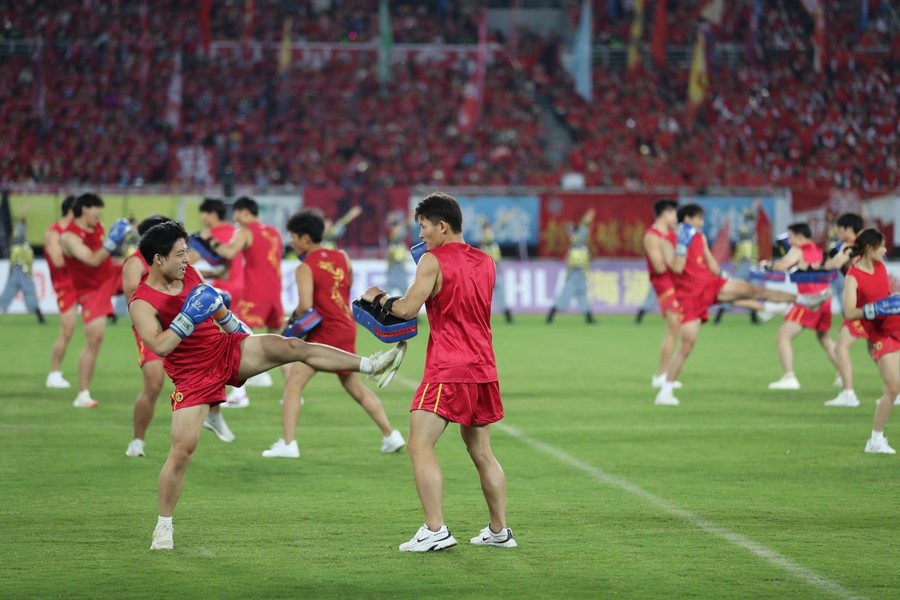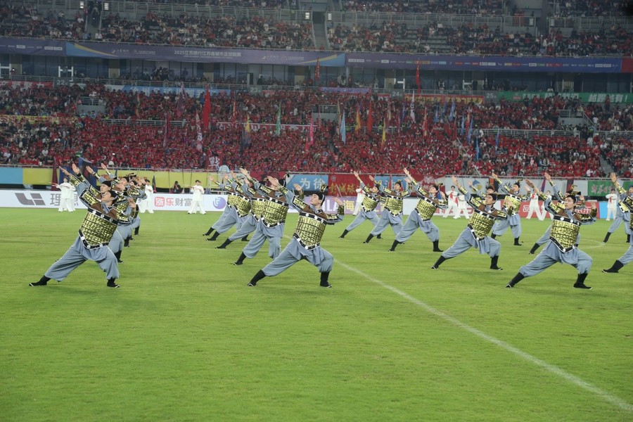 9月20日晚,“蘇超”聯(lián)賽第12輪徐州隊與蘇州隊的比賽在徐州奧體中心拉開帷幕。開賽前夕,169名江蘇師范大學(xué)學(xué)子以一場氣勢恢宏的《大漢雄風》表演,將現(xiàn)場氛圍推向首個高潮。這場長達7分鐘的表演,將中華武術(shù)與兵馬俑舞元素深度融合,以?“武魂起,俑魄生”為核心理念,通過剛猛凌厲的武技與雄渾厚重的舞姿,生動再現(xiàn)了古代戰(zhàn)場的豪情。刀光隨鼓點流轉(zhuǎn),陣型隨韻律變幻,動靜之間,令現(xiàn)場數(shù)萬名觀眾沉浸于跨越時空的文化震撼,更彰顯出徐州作為兩漢文化發(fā)源地的深厚底蘊。