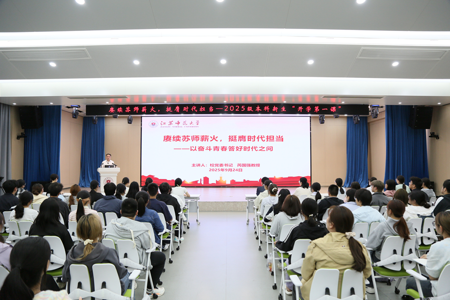 9月24日下午,校黨委書記芮國強(qiáng)以《賡續(xù)蘇師薪火,挺膺時(shí)代擔(dān)當(dāng)——以奮斗青春答好時(shí)代之問》為題,為2025級(jí)本科新生講授“開學(xué)第一課”。