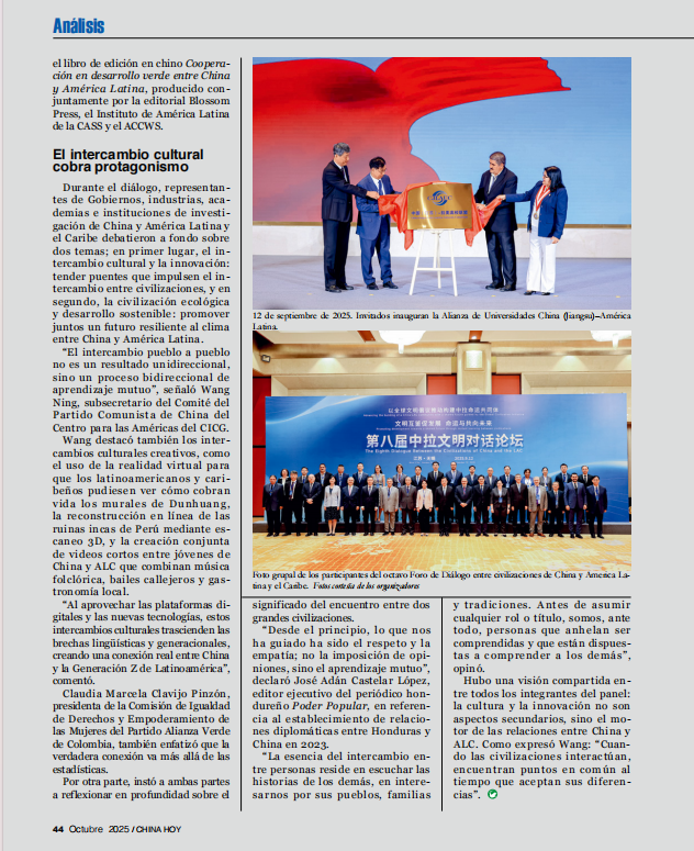 此次報道源于今年9月在江蘇無錫舉辦的第八屆中拉文明對話論壇,該論壇由江蘇省人民政府外事辦公室、中國社會科學院拉丁美洲研究所、中國外文局當代中國與世界研究院聯合主辦。作為本屆論壇的兩項重要成果之一,由我校作為會長單位聯合22所國內高校和33所拉美高校、科研機構共同發起的“中國(江蘇)—拉美高校聯盟”正式成立。中國外文局依托《今日中國》雜志的國際傳播影響力,以“中國—拉美高校校長對話”形式,邀請我校校長杜增吉教授和拉方創始成員單位——秘魯南利馬國立科技大學校長格拉迪斯·克魯斯教授共話中拉合作新路徑。
