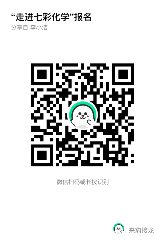 六、報名方式:請感興趣的老師于7月20日(周四)下午3:00前,掃描下方二維碼填寫真實報名信息,并同時加入“七彩化學(xué)”微信群,報名人數(shù)較多時將隨機抽取。聯(lián)系人:李潔老師,電話:15852001020。后期活動請各位家長及時關(guān)注學(xué)校、學(xué)院(http:chem.jsnu.edu.cn)網(wǎng)站通知。
