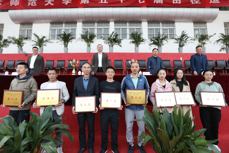 21日下午,在完成全部賽事后,江蘇師范大學第五十七屆田徑運動會勝利閉幕。有關校領導和校體育委員會全體委員出席閉幕式。閉幕式上宣布了比賽結果,并舉行了頒獎儀式。敬文書院獲得學生組男女團體總分第一名,物理與電子工程學院獲得教工組男女團體總分第一名,分別蟬聯“流動獎杯”。化學與材料科學學院、敬文書院、教育科學學院(教師教育學院)、物理與電子工程學院、生命科學學院、外國語學院、機電工程學院、商學院等8家單位獲得本屆田徑運動會精神文明獎。教育科學學院(教師教育學院)、音樂學院、體育學院獲得本屆運動會“體育文化展示”一等獎。