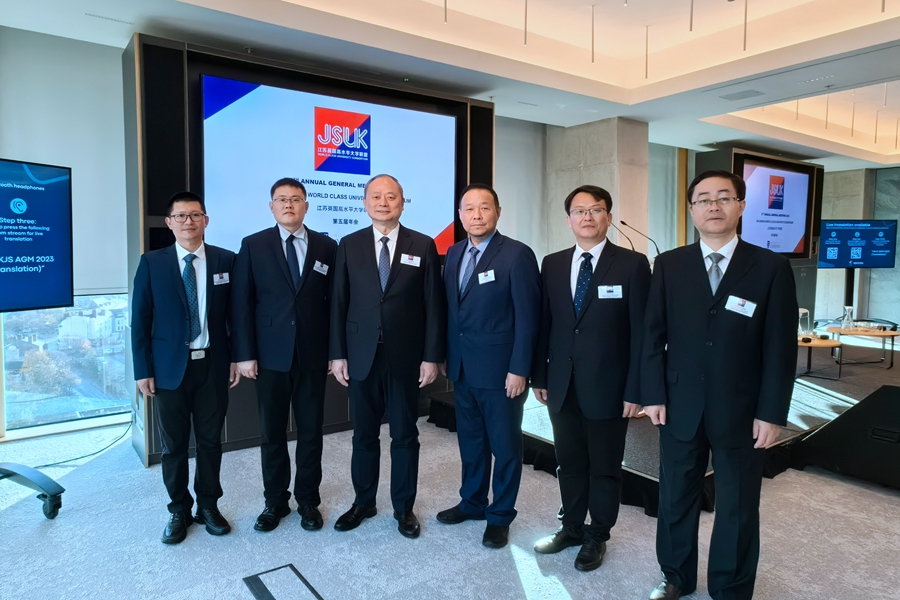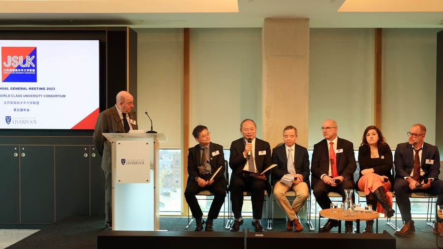 結束蘭卡斯特的訪問后,代表團一行來到英國利物浦大學并參加2023年江蘇-英國高水平大學聯盟年會暨第五屆國際產學研合作論壇。16日,訪問團聽取了第五屆國際產學研合作論壇部分專家報告。17日,訪問團參加2023年江蘇-英國高水平大學聯盟年會的全部議程,首先聽取了江蘇和英國雙方聯盟所作聯盟工作報告,隨后,中國駐曼徹斯特總領事唐銳先生、英國文化教育協會華東區主任兼文化教育領事卡特?辛克萊?瓊斯、利物浦市議會議員尼克?思默、江蘇省教育廳一級巡視員徐子敏、利物浦大學常務副校長魏比?泛德?霍克為大會分別致辭。