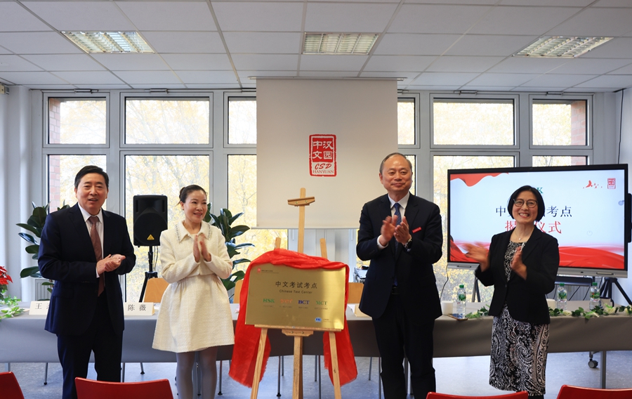 方忠和彭雯共同為漢園中文學校“中文考試考點”揭牌。方忠表示,江蘇師范大學在組織漢語水平測試方面經驗豐富,在江蘇設有國內考點,在美國與邁阿密亞裔商務聯盟共建考點,并連續兩年被漢考國際評為全球優秀海外考點,漢園中文學校“中文考試考點”必將為華文教育發揮重要作用。