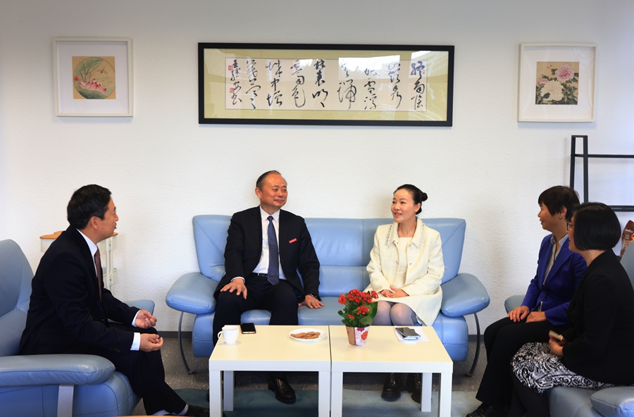 結束英國訪問后,訪問團一行乘機來到德國杜塞爾多夫,首先訪問德國漢園中文學校(萊茵校區),與我校杰出校友、漢園中文學校董事長王杰和校長孫曉帆洽談合作,中國駐杜塞爾多夫總領館領僑部主任彭雯、全德中文學校聯合總會副會長陳薇應邀出席活動。為推進海外華文教育的不斷升級,系統提高德國本土中文教師的專業水平,江蘇師范大學與德國漢園中文學校決定在杜塞爾多夫設立“歐洲中文教師教育學院”,并現場簽約。