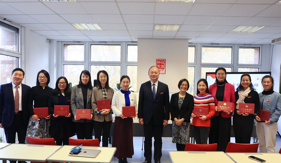 訪問期間,江蘇師范大學和漢園中文學校共同舉行了德國首屆專業中文教師高級別研修班結業典禮。方忠為20位學員頒發了結業證書并佩戴校徽,向他們的順利畢業表示祝賀,同時表示江蘇師范大學永遠都是校友的堅強后盾,期望大家在德國工作順利,努力為歐洲華文教育貢獻力量。最后,江蘇師范大學成立歐洲校友會籌備組,校友會總部設在德國漢園中文學校,聘任王杰為歐洲校友會籌備組主任,方忠對王杰校長在校友會籌備工作的辛苦付出表示感謝,并希望歐洲校友會能盡快完成籌備,并發揮作用。