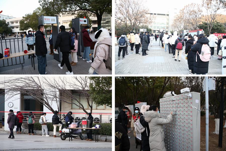 學校堅持考生為本、考生至上,科學規劃考生進出考點路線,通過官方網站、微信公眾號等途徑發布了考點考前公告,涉及入校提醒、交通提醒、就餐提醒等,并通過研招網給每個考生發送有關安檢、手機管理等提醒。通過繪制校園卡通示意圖、制作考場查詢二維碼、張貼校園指示牌、提前一天下午開放校園等方式幫助考生提前熟悉考點情況。為方便廣大考生順利應考,考試前,我校組織志愿者進行智能安檢門安全檢查、存放手機等模擬演練,校領導帶隊觀摩手機集中存放、智能安檢門檢查等新增環節的實施流程,并對安檢方案持續優化提出建議。