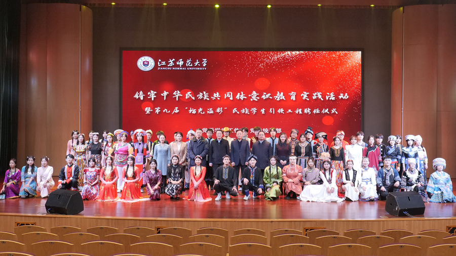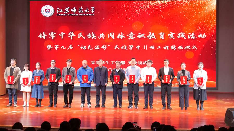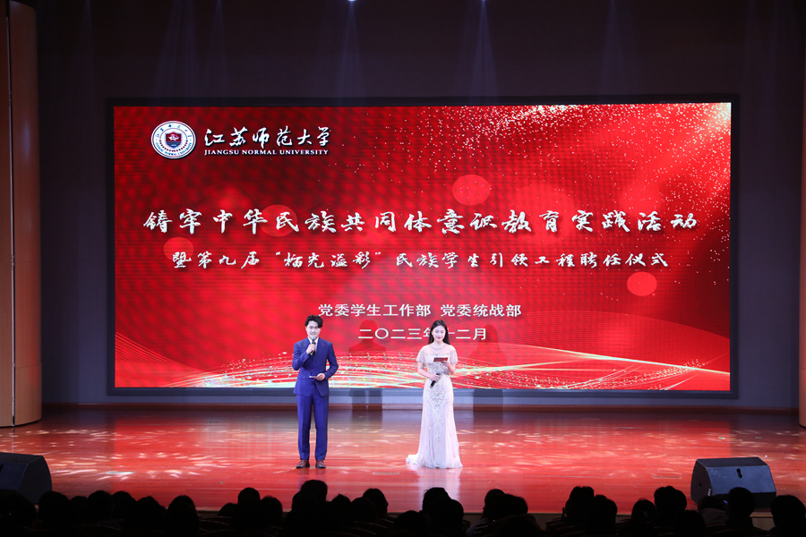 12月29日晚,江蘇師范大學鑄牢中華民族共同體意識教育實踐活動暨第九屆“榴光溢彩”民族學生引領工程聘任儀式在泉山校區馬可音樂廳舉行。校黨委常委、副校長張玉勤出席本次活動并講話,黨委宣傳部、黨委統戰部、黨委學生工作部、保衛處、團委等相關職能部門負責同志參加活動。