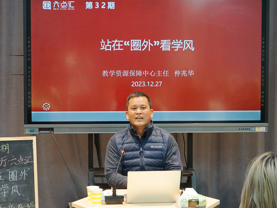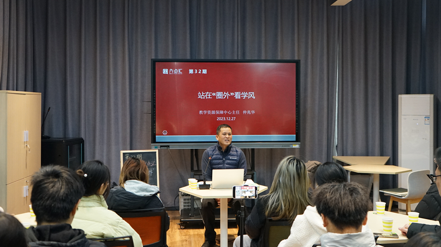 近日,第32期“餐廳·六點匯”活動在泉山校區(qū)六點匯實踐基地舉行。教學(xué)資源保障中心主任仲兆華以“站在‘圈外’看學(xué)風(fēng)”這一主題與在場同學(xué)進(jìn)行交流。