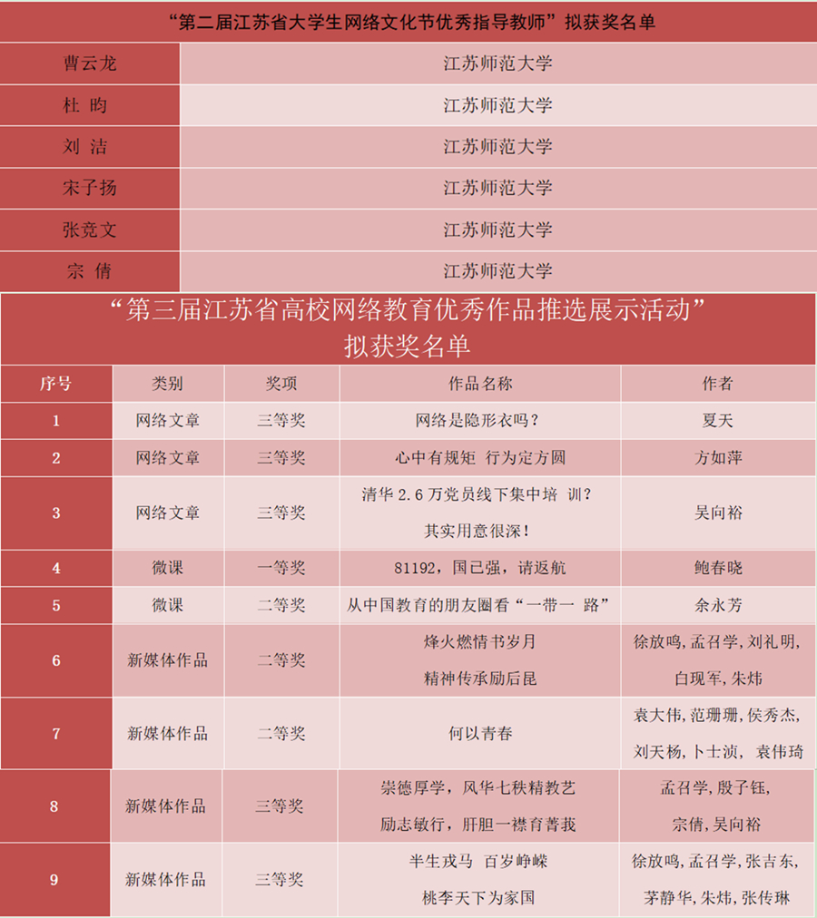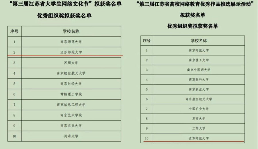 在剛剛結(jié)束的第三屆江蘇省大學(xué)生網(wǎng)絡(luò)文化節(jié)暨高校網(wǎng)絡(luò)育人優(yōu)秀作品推選展示活動(dòng)(簡(jiǎn)稱(chēng)“一節(jié)一推選”)中,我校師生總計(jì)獲得59項(xiàng)獎(jiǎng)項(xiàng),其中一等獎(jiǎng)12項(xiàng),二等獎(jiǎng)22項(xiàng),三等獎(jiǎng)25項(xiàng),學(xué)校獲評(píng)雙“優(yōu)秀組織獎(jiǎng)”。