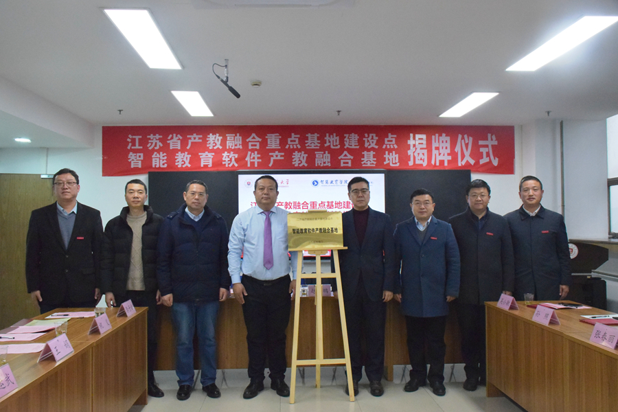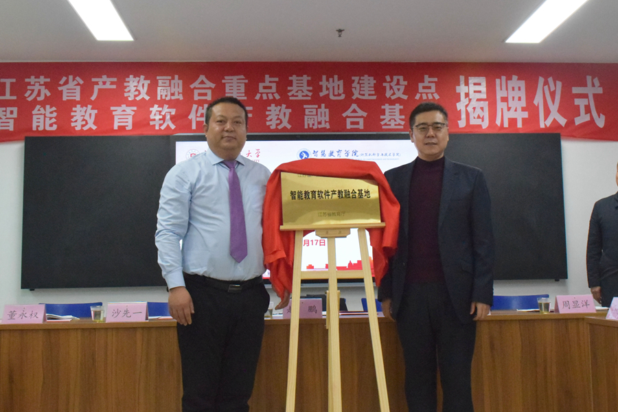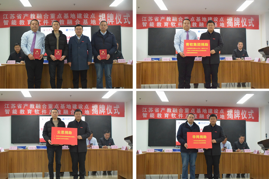 趙鵬和李剛共同為江蘇省產(chǎn)教融合重點(diǎn)基地建設(shè)點(diǎn)(智能教育軟件產(chǎn)教融合基地)揭牌。合作企業(yè)向基地和學(xué)院捐助了平臺(tái)資源及免費(fèi)師資培訓(xùn)項(xiàng)目。儀式上,還為相關(guān)企業(yè)家代表頒發(fā)了產(chǎn)教融合基地建設(shè)顧問(wèn)聘書(shū)。