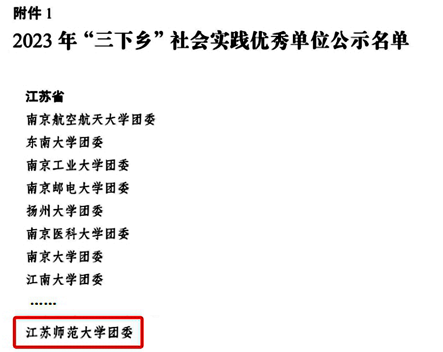在省級(jí)表彰中,語(yǔ)言科學(xué)與藝術(shù)學(xué)院推普志愿服務(wù)團(tuán)隊(duì)獲評(píng)2023年江蘇省文化科技衛(wèi)生“三下鄉(xiāng)”活動(dòng)優(yōu)秀團(tuán)隊(duì)。商學(xué)院數(shù)字富農(nóng)鄉(xiāng)村振興調(diào)研團(tuán)等6支團(tuán)隊(duì)獲評(píng)江蘇省暑期文化科技衛(wèi)生“三下鄉(xiāng)”社會(huì)實(shí)踐活動(dòng)優(yōu)秀團(tuán)隊(duì),公共管理與社會(huì)學(xué)院、語(yǔ)言科學(xué)與藝術(shù)學(xué)院2篇調(diào)研報(bào)告獲評(píng)優(yōu)秀調(diào)研報(bào)告,機(jī)電工程學(xué)院社會(huì)實(shí)踐基地獲評(píng)優(yōu)秀社會(huì)實(shí)踐基地,吳夏蓉等5位老師獲評(píng)先進(jìn)工作者,陳琳利等8位同學(xué)獲評(píng)先進(jìn)個(gè)人。“手繪鄉(xiāng)村·青春行動(dòng)”“垃圾分類(lèi)·青春助力”專(zhuān)項(xiàng)實(shí)踐活動(dòng)中,數(shù)學(xué)與統(tǒng)計(jì)學(xué)院2支實(shí)踐團(tuán)隊(duì)獲評(píng)省優(yōu)秀團(tuán)隊(duì),李琳等5位同學(xué)獲評(píng)優(yōu)秀志愿者。