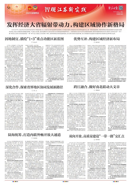 為貫徹落實習近平總書記在江蘇代表團重要講話精神,省重點智庫我校“一帶一路”研究院聚焦江蘇高質量推進“一帶一路”交匯點建設、省內全域一體化、省際毗鄰地區協同發展新成效,深入探討其背后發展機制,為江蘇拓展開放發展新空間提供有力理論支撐和智力支持。《新華日報》3月9日在“2024全國兩會智觀江蘇新實踐”版面,以“發揮經濟大省輻射帶動作用,構建區域協作新格局”為題進行了專門報道,其主要內容如下: