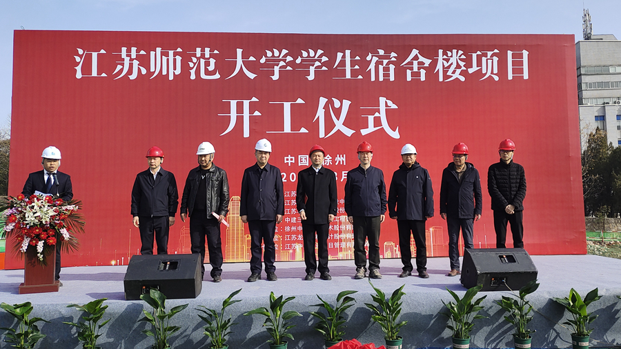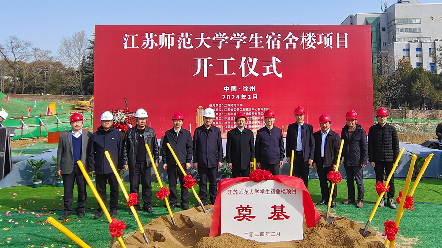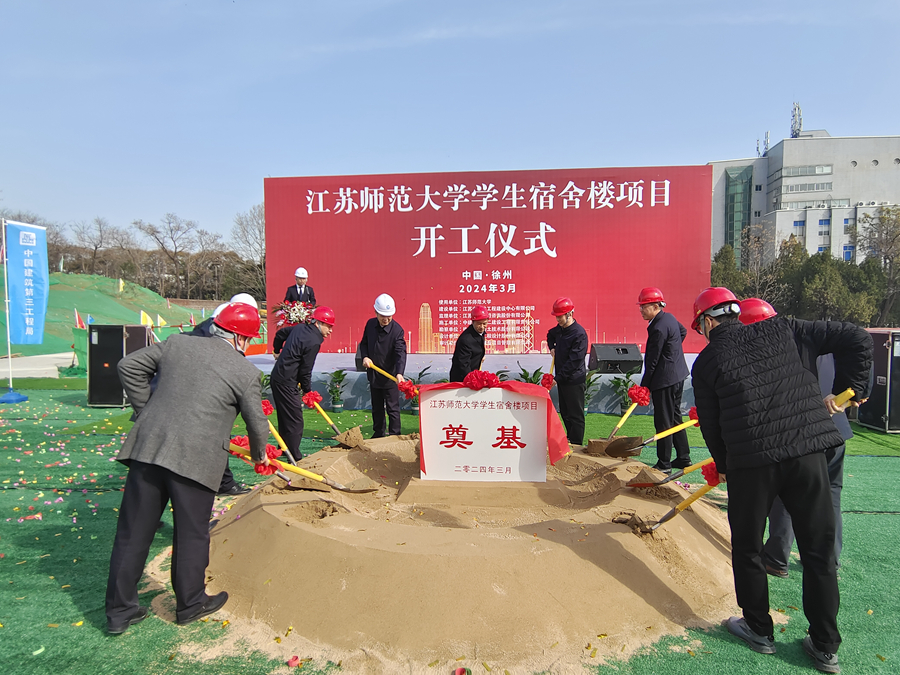 3月21日上午,我校學生宿舍樓項目開工儀式在泉山校區順利舉行。校黨委常委、副校長張其飛,江蘇省住房與城鄉建設廳政府投資工程集中建設管理處副處長馮剛,江蘇省公共工程建設中心有限公司黨總支書記、執行董事陳海陸,中建三局華東分局副局長、江蘇投資建設有限公司董事長夏大焰等出席儀式并共同為項目培土奠基。項目勘察單位、設計單位、監理單位、跟蹤審計單位及我?;ㄌ帯⒑笄诠芾硖?、后勤集團等相關負責人參加了開工儀式。