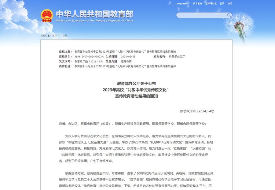 2023年高?!岸Y敬中華優秀傳統文化”宣傳教育活動由教育部思想政治工作司主辦,以“根植文化沃土匯聚奮進力量”為主題,分為“國學史園”知識競答、“紅色家園”視頻展覽、“水墨校園”繪畫聯播、“非遺學園”技藝比拼四項活動內容,旨在深入挖掘中華優秀傳統文化價值內涵,推動中華優秀傳統文化創造性轉化、創新性發展,以馬克思主義中國化時代化最新成果激發中華優秀傳統文化的生機與活力,用社會主義核心價值觀鑄魂育人,濃厚校園文化氛圍,增強校園文化活力,著力培養擔當民族復興大任的時代新人。