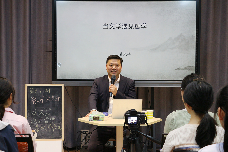 4月17日下午,第35期“餐廳·六點(diǎn)匯”活動在泉山校區(qū)“餐廳·六點(diǎn)匯”實踐基地舉行。文學(xué)院黨委葛大偉書記就“當(dāng)文學(xué)遇見哲學(xué)”這一主題與在場同學(xué)進(jìn)行交流。