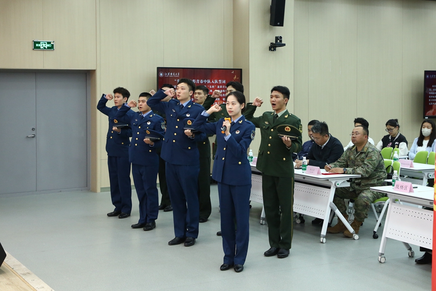 趙超為“先勝”迷彩青春中隊授予隊旗,校團委李丹書記宣讀中隊章程,中隊成員代表進行入隊宣誓,并與32506部隊某連隊簽署共建協議,學校聘任國防教育輔導員,標志著“先勝”中隊順利成立。中隊將積極為學校國防教育、學生軍訓、征兵工作、校園文化、社會服務、公益實踐等工作貢獻青春力量。