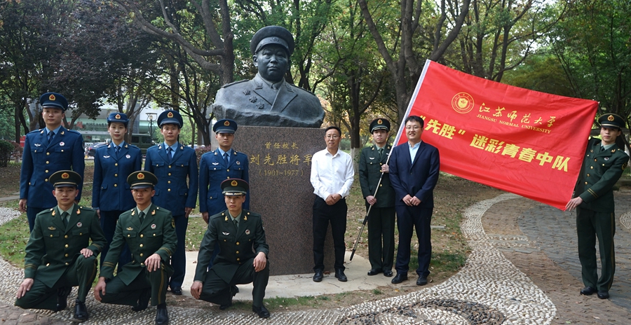 泉山區人民武裝部軍事科劉峰在成立儀式后做征兵動員宣講,“先勝”迷彩青春中隊成員代表拜謁劉先勝中將雕像。