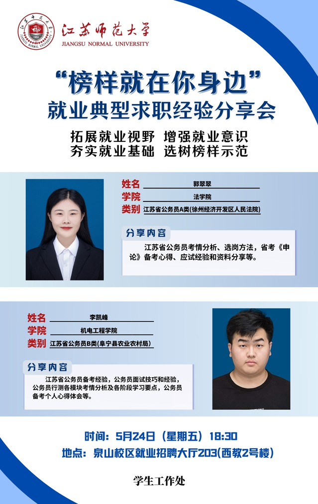 為增強(qiáng)學(xué)生就業(yè)意識(shí),拓寬就業(yè)視野,夯實(shí)就業(yè)基礎(chǔ),學(xué)生工作處結(jié)合學(xué)生關(guān)注度高、求職意愿強(qiáng)烈的行業(yè)領(lǐng)域,開展“榜樣就在你身邊”就業(yè)典型求職經(jīng)驗(yàn)分享會(huì),充分發(fā)揮朋輩榜樣的示范引領(lǐng)作用,幫助更多的學(xué)生提升就業(yè)競(jìng)爭(zhēng)力。經(jīng)學(xué)院推薦、學(xué)校遴選,現(xiàn)將第十期活動(dòng)開展相關(guān)情況通知如下: