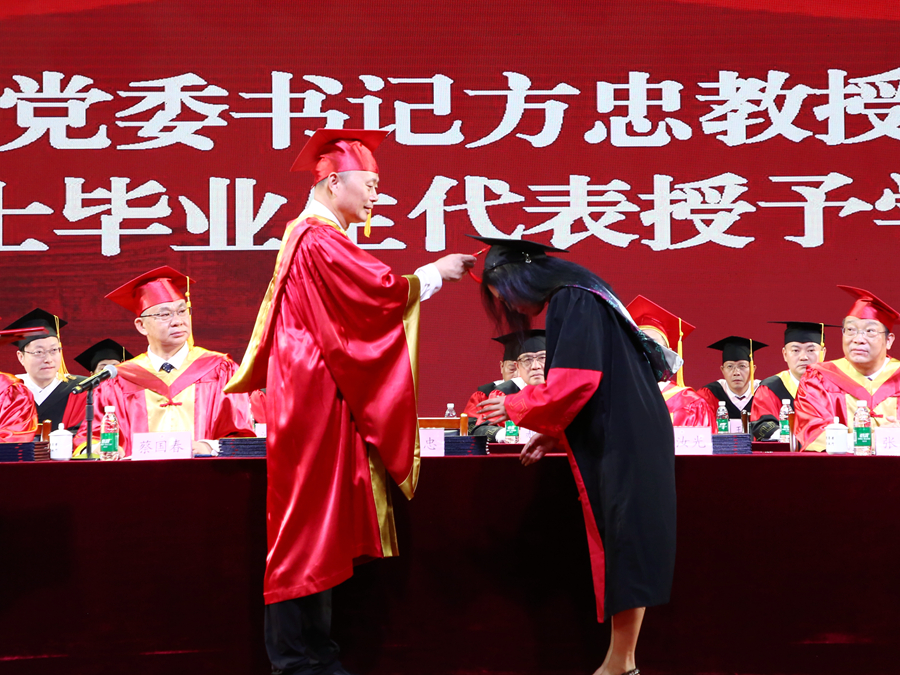 副校長、校學(xué)位評定委員會副主席杜增吉宣讀學(xué)位授予決定。校黨委書記方忠為博士畢業(yè)生代表正冠撥穗并授予學(xué)位。校領(lǐng)導(dǎo)、校學(xué)位評定委員會委員為全體2024屆碩士畢業(yè)研究生正冠撥穗,祝賀他們順利畢業(yè)。