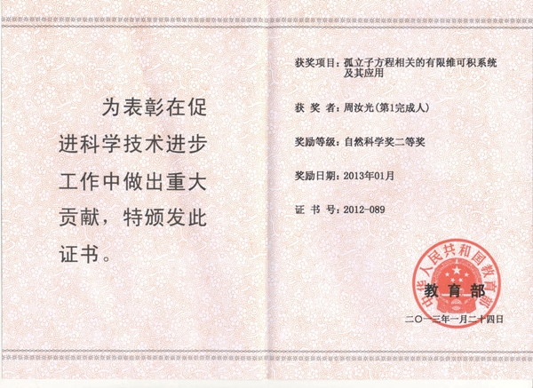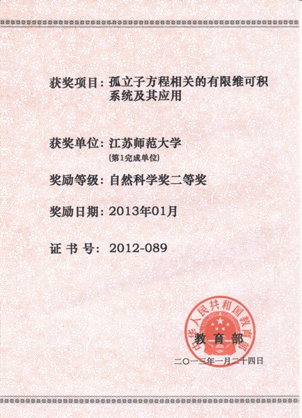 教育部日前公布《關于2012年度高等學校科學研究優秀成果獎(科學技術)獎勵的決定》,以江蘇師范大學為獨立完成單位、副校長周汝光教授主持完成的科研成果“孤立子方程相關的有限維可積系統及其應用”獲2012年度高等學校科學研究優秀成果獎自然科學二等獎。 高等學校科學研究優秀成果獎(科學技術)是教育部面向全國高等院校廣大科技工作者設立的獎項,每年評審一次。2012年度,全國共有99項科研成果獲高等學校科學研究優秀成果獎自然科學獎,其中一等獎36項、二等獎63項。