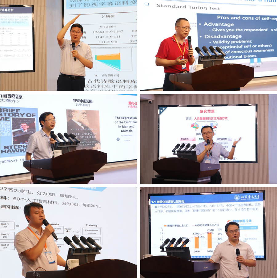 國際人類腦圖譜學會(OHBM)主席、北京大學講席教授高家紅首先分享了《人腦成像技術及其在認知研究中的應用》;華東師范大學心理與認知科學學院教授蔡清做了題為《大腦中的語義表征和加工》的報告;香港中文大學語言學及現代語言學系副教授馮剛毅的報告聚焦于《語言學習與加工的大腦動態表征》;上海科技大學計算認知與轉化神經科學實驗室主任李遠寧教授做了題為《語音感知與表達的神經機制、模型與腦機接口》的報告;江蘇師范大學副教授胡偉在《語言神經基礎的分子生物學視角》的報告中,介紹了全基因組測序、基因編輯技術及腦類器官等新技術在語言研究中的應用前景;中國科學技術大學張效初教授做了題為《人對AI的感知與態度研究》的報告;南京師范大學心理學院院長陳慶榮教授分享了《古詩閱讀的計算和認知神經機制》;中國科學院心理研究所研究員杜憶做了題為《人腦的皮層拓撲組織模式支持語義提取的腦網絡動態交互模式》的報告;北京師范大學心理學部認知神經科學與學習國家重點實驗室教授、IDG麥戈文腦研究院教授秦紹正做了題為《人腦情感認知的心理表征及其計算機制研究》的報告;中山大學附屬第一醫院康復醫學科研究員劉漢軍做了題為《經顱磁刺激聯合因果推斷分析揭示言語產生因果性機制的研究》的報告;華南師范大學心理學院教授、教育部哲學社會科學“兒童青少年閱讀與發展” 實驗室副主任梅磊磊做了題為《詞匯閱讀中左腹側顳枕皮層的功能解析》的報告;江蘇師范大學語言科學與藝術學院副院長、江蘇特聘教授朱祖德做了題為《從健康老化到病理老化的語言退化不平衡特征》的報告。一場場特邀報告精彩豐呈,學者們交流了研究成果,也為與會師生代表貢獻了一場學術盛宴。