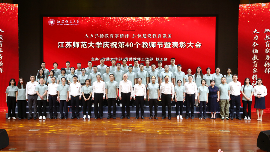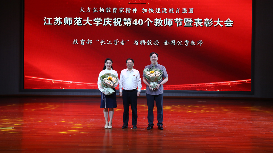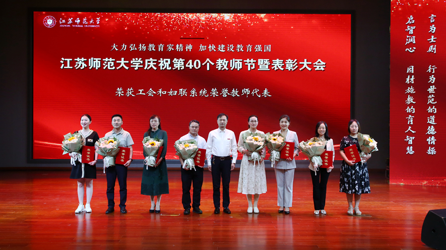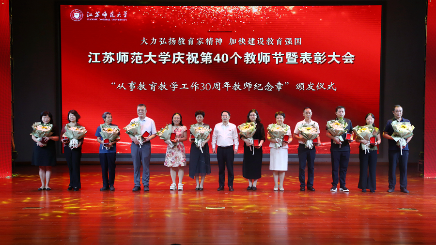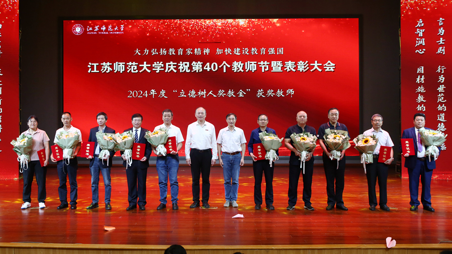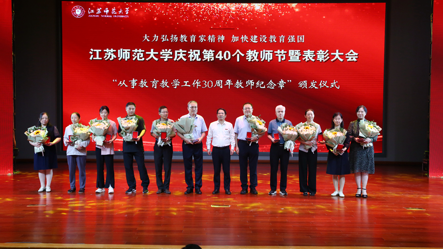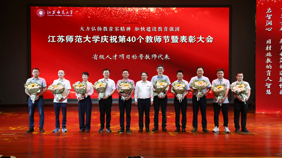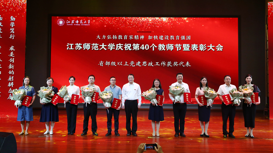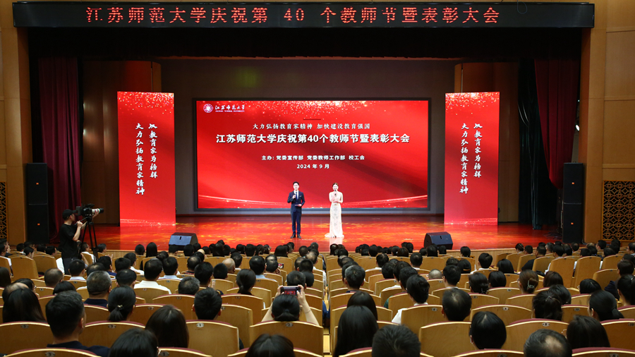 校黨委書記方忠在表彰大會上致辭,代表學校黨政向全校教師和奮戰在教育教學一線和管理服務崗位的教職員工致以崇高的敬意和節日的問候,向全體新入職的教職工們表示熱烈的歡迎。他指出,2023年教師節前夕,習近平總書記致信全國優秀教師代表時提出了中國特有的教育家精神,為新時代教師隊伍建設指明了前進方向、提供了根本遵循。黨的二十屆三中全會對進一步全面深化改革推進中國式現代化進行了系統擘畫,提出“教育、科技、人才是中國式現代化的基礎性、戰略性支撐”,并對深化教育綜合改革作出部署。方忠勉勵全體教職工,要堅定信念,涵養高尚情操,強化“師德”之本;要以生為本,潛心教書育人,恪守“人師”之道;要求是創新,練就過硬本領,筑牢“強師”之基。他希望廣大教師深刻領會高校作為教育、科技、人才重要結合點的基礎性、戰略性支撐作用,進一步聚焦我校“特色鮮明、國內一流、國際知名的高水平師范大學”建設目標,凝心聚力擘畫奮進藍圖,團結一致推動高質量發展,為中國式現代化的宏偉事業貢獻江蘇師范大學的力量。