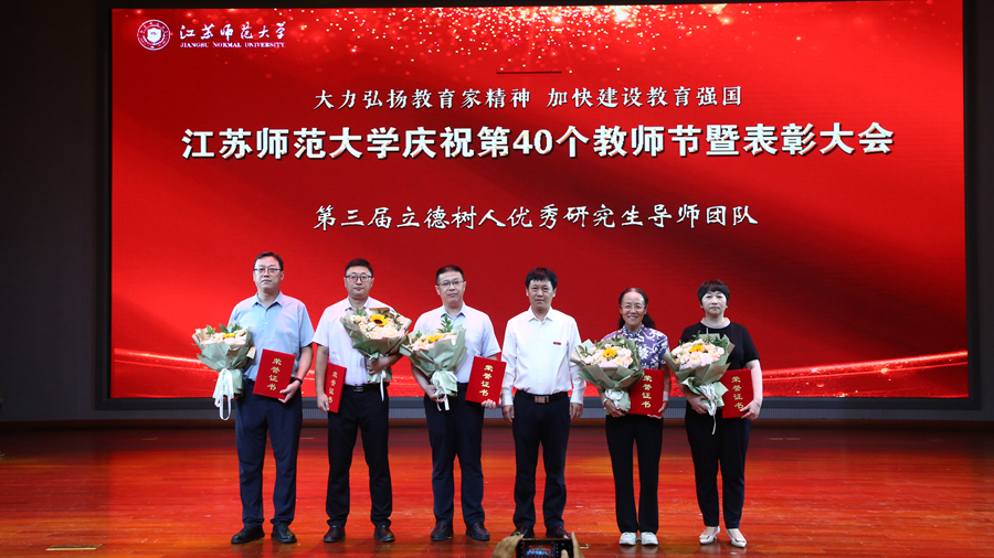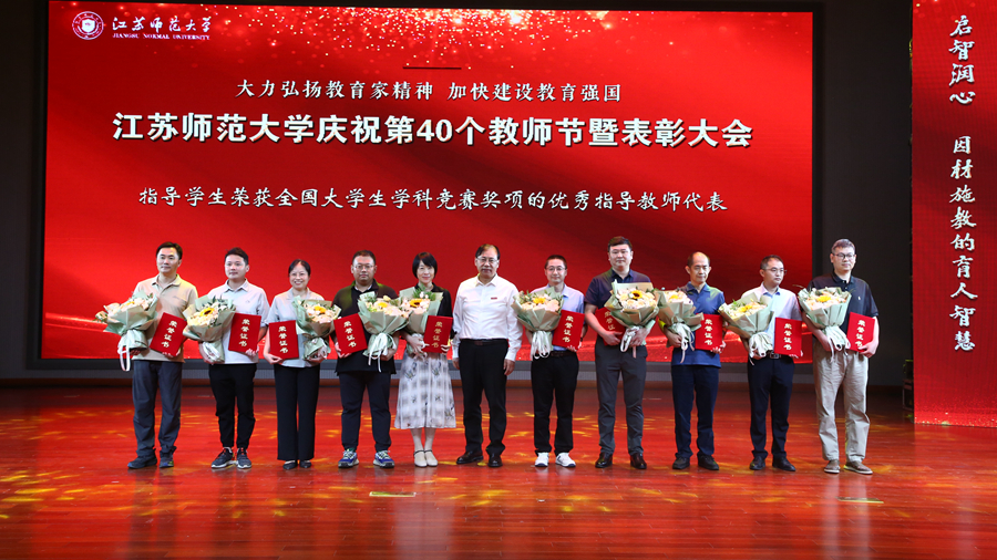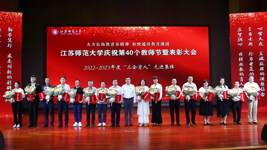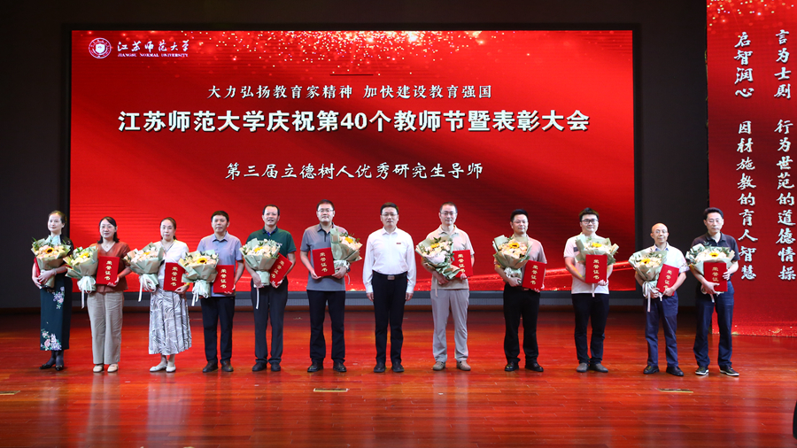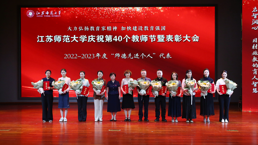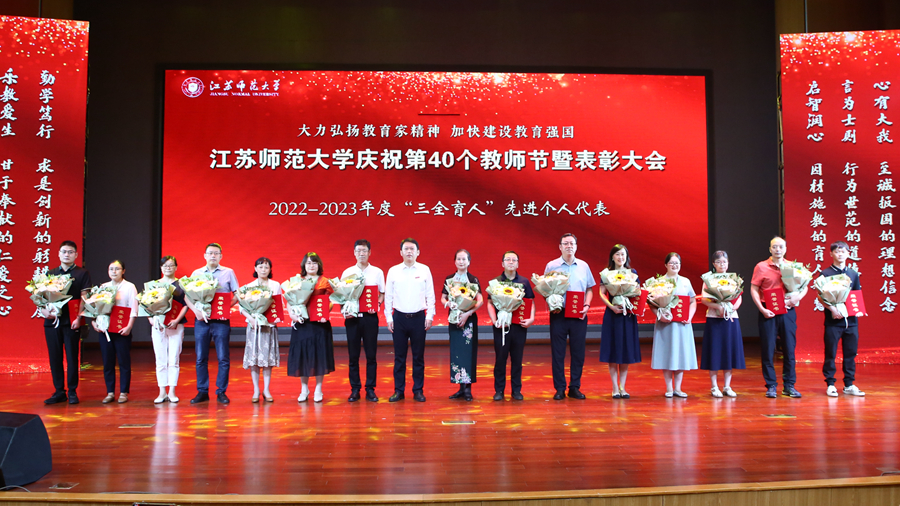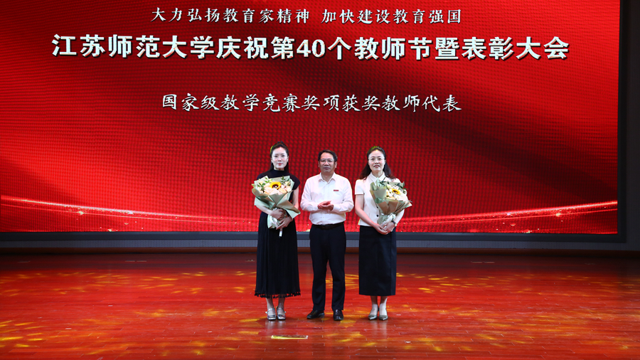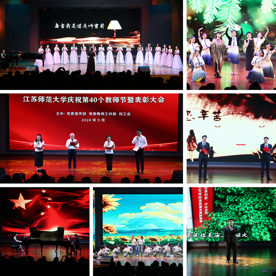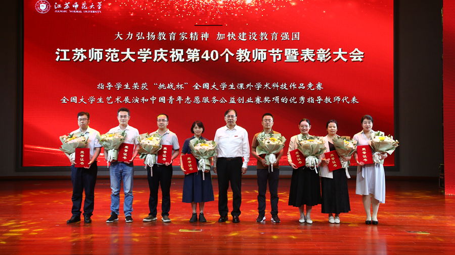 校黨委書記方忠在表彰大會上致辭,代表學校黨政向全校教師和奮戰在教育教學一線和管理服務崗位的教職員工致以崇高的敬意和節日的問候,向全體新入職的教職工們表示熱烈的歡迎。他指出,2023年教師節前夕,習近平總書記致信全國優秀教師代表時提出了中國特有的教育家精神,為新時代教師隊伍建設指明了前進方向、提供了根本遵循。黨的二十屆三中全會對進一步全面深化改革推進中國式現代化進行了系統擘畫,提出“教育、科技、人才是中國式現代化的基礎性、戰略性支撐”,并對深化教育綜合改革作出部署。方忠勉勵全體教職工,要堅定信念,涵養高尚情操,強化“師德”之本;要以生為本,潛心教書育人,恪守“人師”之道;要求是創新,練就過硬本領,筑牢“強師”之基。他希望廣大教師深刻領會高校作為教育、科技、人才重要結合點的基礎性、戰略性支撐作用,進一步聚焦我校“特色鮮明、國內一流、國際知名的高水平師范大學”建設目標,凝心聚力擘畫奮進藍圖,團結一致推動高質量發展,為中國式現代化的宏偉事業貢獻江蘇師范大學的力量。