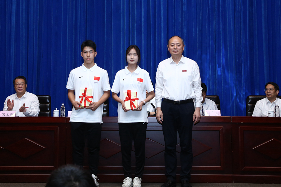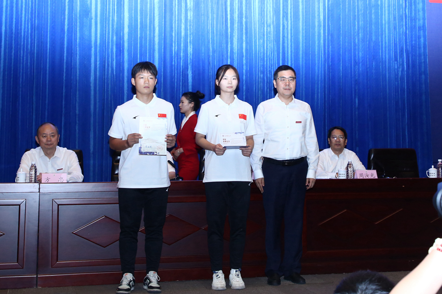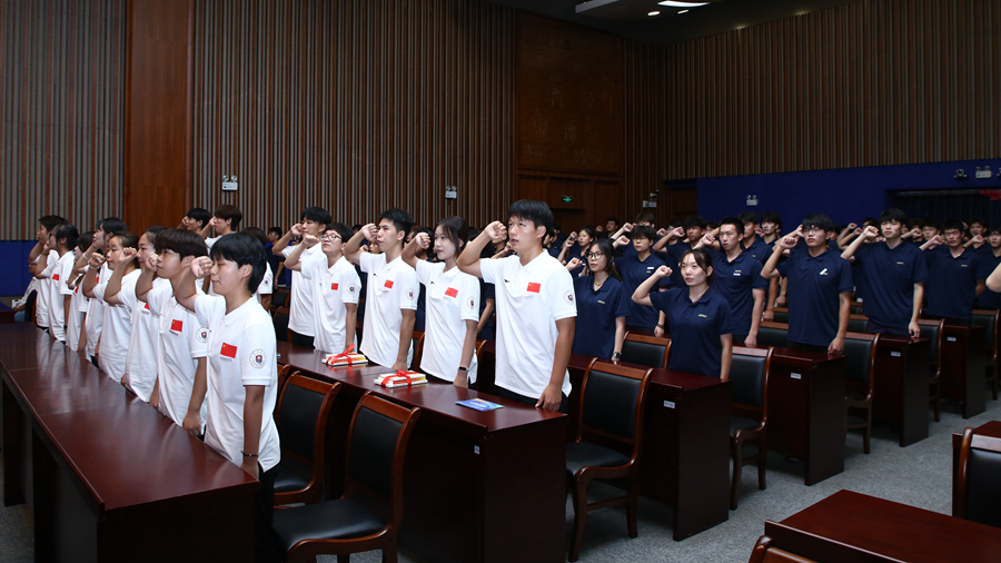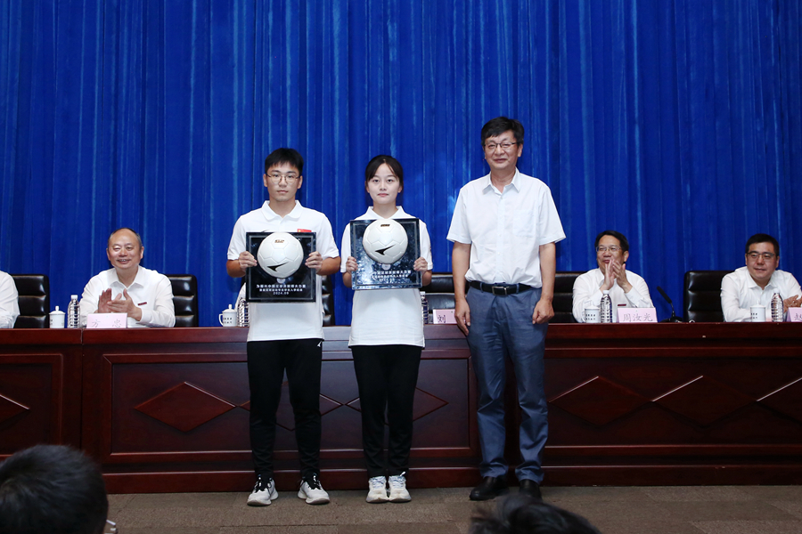 劉彤向?qū)W生代表贈送紀(jì)念足球,方忠向?qū)W生代表贈書,張玉勤向足球運(yùn)動專業(yè)學(xué)業(yè)導(dǎo)師、輔導(dǎo)員、班主任頒發(fā)聘書,趙鵬向?qū)W生代表頒發(fā)足球運(yùn)動專業(yè)錄取榮譽(yù)證書。全體學(xué)生莊嚴(yán)宣誓,時刻準(zhǔn)備著,為足球事業(yè)高質(zhì)量發(fā)展不懈奮斗,為中華民族偉大復(fù)興不懈奮斗。