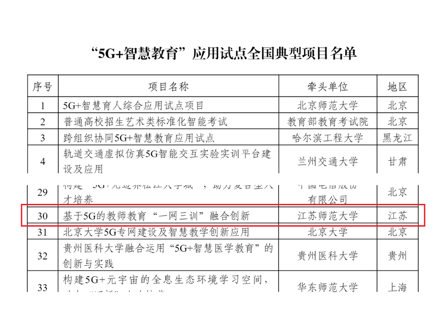 近日,工信部、教育部公布了“5G+智慧教育”應用試點全國典型項目和通過驗收項目名單,我校自2022年起牽頭行業領軍企業中國移動、科大訊飛、百度以及徐州市電教中心合作共研的《基于5G的教師教育“一網三訓”融合創新》項目順利通過驗收,并入選“5G+智慧教育”應用試點全國典型項目。據悉,本次“5G+智慧教育”應用試點通過驗收的項目共計93個,其中44個入選全國典型項目。