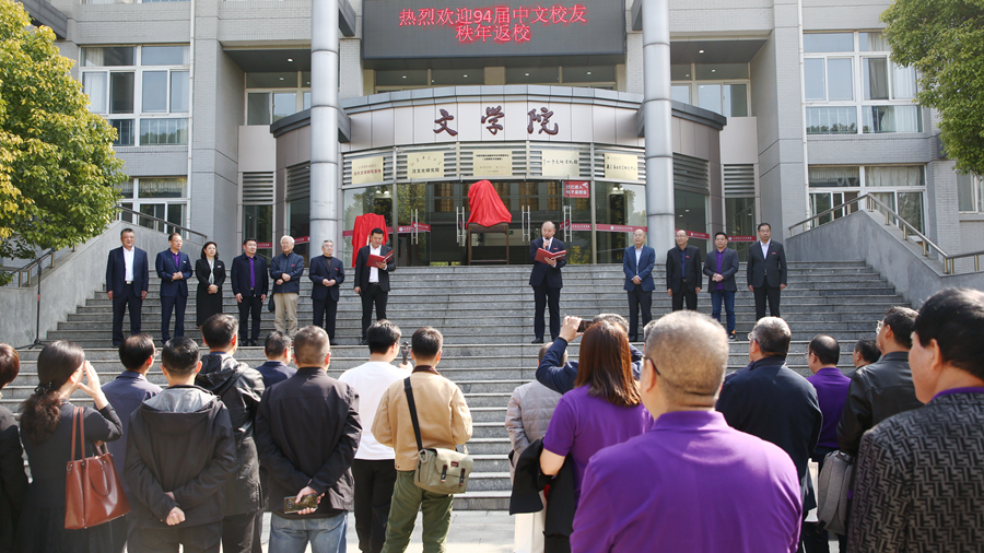 10月26日,我校在西教11號樓前舉行文學院院史館揭牌暨1994屆中文校友捐贈儀式。校黨委書記方忠、中文系教師代表徐放鳴、寇立光、趙興勤、吳建民、張淑美,校鹽城校友會會長、中文83級校友吳德東,校蘇州校友會會長、中文98級校友王建波,中文94屆參加秩年返校活動的全體校友出席活動。