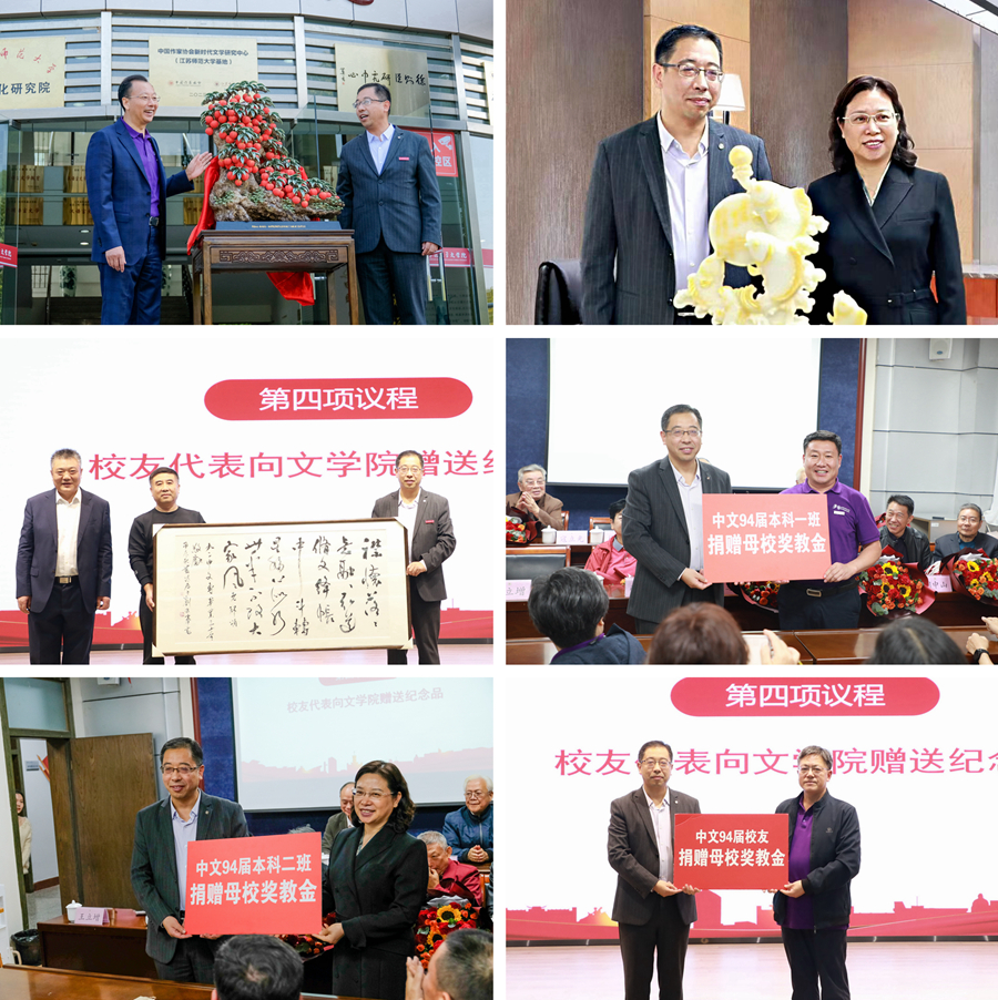 儀式上,中文94屆任課教師代表方忠、徐放鳴和中文94屆校友代表李文林、胡忠秀、陳碩共同為院史館揭牌。李鳳亮校友代表中文90(1)班向學院捐贈了寓意人才培養碩果累累的石灣荔枝陶塑,胡忠秀校友代表中文90(2)班向學院捐贈了寓意魚躍龍門、蒸蒸日上的工藝品,陳碩校友代表中文92專科班向學院捐贈了嵌藏學院院訓的原創詩歌、書法藝術作品,校友們還分別以班級、年級為單位認捐了學校的校友林,并向學院捐贈了獎教金。文學院向每位校友回贈了精心設計的文創紀念品。儀式結束后,校友們在講解人員引導下,逐一參觀了院史文化墻、院史資料珍藏館、新時代文學研究中心、中國鄉村志文化研究中心等文學院展館群,并在下午舉行了氣氛熱烈的師生見面會。