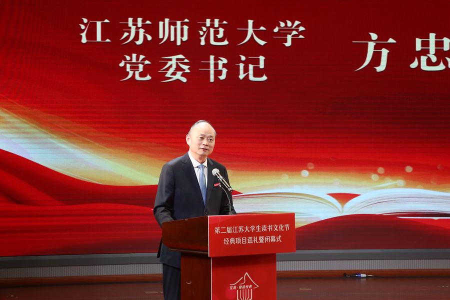 方忠在會(huì)上致辭,對(duì)來自全省兄弟院校領(lǐng)導(dǎo)和師生代表表示熱烈歡迎,對(duì)讀書節(jié)的圓滿閉幕表示熱烈祝賀。他表示,閱讀是人類獲取知識(shí)、啟智增慧、培養(yǎng)道德的主要途徑,是樹立崇高理想、涵養(yǎng)浩然之氣的重要方式。習(xí)近平總書記在致首屆全民閱讀大會(huì)的賀信中指出:“希望全社會(huì)都參與到閱讀中來,形成愛讀書、讀好書、善讀書的濃厚氛圍。”江蘇師大高度重視“書香校園”建設(shè),已連續(xù)舉辦了23屆校園讀書節(jié),打造了一系列具有特色的品牌活動(dòng),在推廣閱讀方面取得一系列成績(jī)。學(xué)校將以高標(biāo)準(zhǔn)“書香校園”建設(shè)引領(lǐng)推動(dòng)全民閱讀事業(yè)發(fā)展,促進(jìn)全民閱讀成為立德樹人、培根鑄魂、啟智增慧的重要途徑。學(xué)校將持續(xù)推動(dòng)大學(xué)生讀書文化節(jié)的發(fā)展繁榮,全面提升文科教育的服務(wù)能力和貢獻(xiàn)水平。