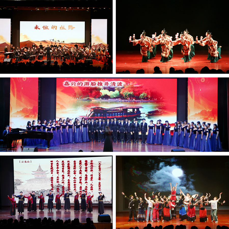 活動(dòng)現(xiàn)場(chǎng)回顧了“每周經(jīng)典導(dǎo)讀”精彩片段,開展了經(jīng)典作品現(xiàn)場(chǎng)誦讀,舉行了“云誦讀”、書評(píng)大賽獲獎(jiǎng)作品頒獎(jiǎng)儀式。來自全省高校的師生代表以歌舞、交響管樂演奏等形式,表達(dá)了對(duì)大學(xué)生閱讀活動(dòng)的喜愛。同時(shí),我校音樂學(xué)院原創(chuàng)的漢樂舞《鼗鼓樂》、誦讀《漢魂千秋》、舞蹈《情系大涼山》、合唱《百年守望》等文藝節(jié)目精彩展現(xiàn)了徐州漢文化的文脈傳承和城市氣質(zhì),彰顯了當(dāng)代江蘇青年在實(shí)踐中增強(qiáng)干事本領(lǐng),把小我融入祖國(guó)的大我、人民的大我之中的豪情壯志。