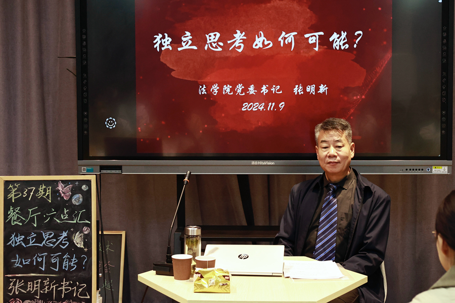 11月9日下午,第37期“餐廳?六點匯”活動在泉山校區“餐廳·六點匯”實踐基地舉行。法學院黨委書記張明新就“獨立思考如何可能”這一主題與在場同學進行交流。