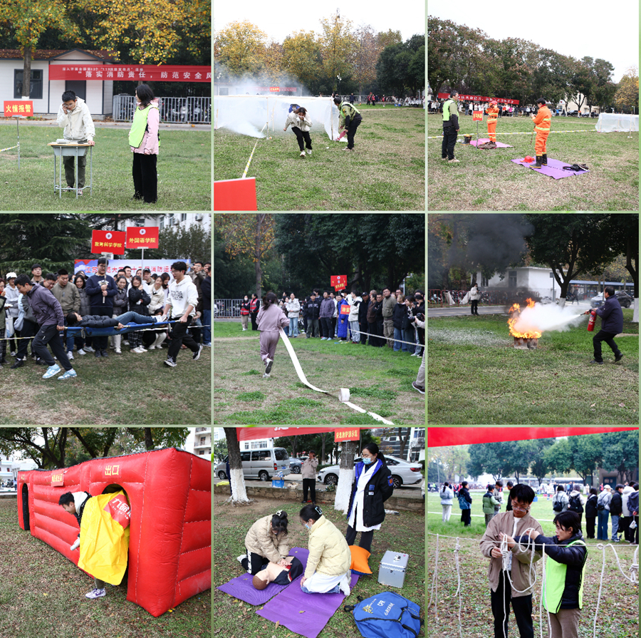本屆消防運動會圍繞“全民消防、生命至上”這一主題,設有火情報警、火場逃生、穿消防服、搶救傷員、連接水帶、油盆滅火六個單項,由師生混合組隊,接力完成。賽場上,選手們你追我趕、密切配合,充分展現(xiàn)了出色的消防技能和團隊協(xié)作精神。經過激烈角逐體育學院、后勤集團、國際學院、文學院、14號聯(lián)隊(國資處、基建處)、馬克思主義學院、科文學院、法學院榮獲本屆消防運動會前八名。現(xiàn)場還設置了煙道逃生、緊急救護、逃生繩結等體驗項目,讓師生們更加深入地了解消防救援知識。