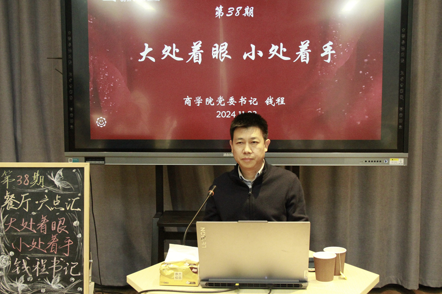 11月23日下午,第38期“餐廳·六點(diǎn)匯”活動(dòng)在泉山校區(qū)“餐廳·六點(diǎn)匯”實(shí)踐基地舉行。商學(xué)院黨委書記錢程就“大處著眼,小處著手”這一主題與在場(chǎng)同學(xué)進(jìn)行交流。