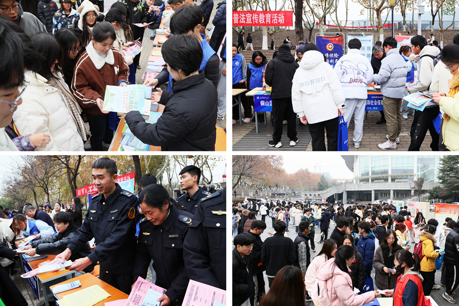 在集中普法宣傳教育活動區,來自銅山區政法委、司法局、人民法院、人民檢察院、教育局、公安局、應急管理局、人力資源和社會保障局等15家單位的普法宣傳員攜手江蘇師范大學普法志愿者大隊志愿者們面向全校師生開展現場普法宣傳教育活動,內容涉及《憲法》《民法典》《反電信網絡詐騙法》《突發事件應對法》《消費者權益保護法》《食品安全法》《勞動法》等領域。在法治游園會活動區域設置了法治盲盒、法治視力表、法治留言板、法治套圈、法治連連看等游戲環節,廣大師生通過參與游戲回答問題、破解法治謎語,掌握憲法知識。活動現場人頭攢動,反響熱烈。
