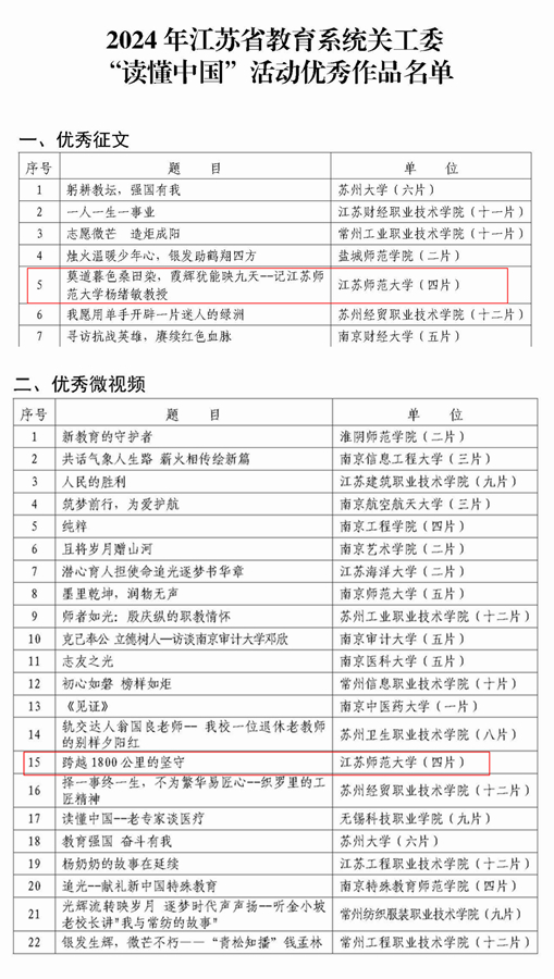 近日,江蘇省教育系統關工委發布《關于公布2024年“讀懂中國”活動入選作品名單的通知》(蘇教關委〔2024〕14號),經層層遴選,多輪評審,全省共評選出優秀征文25篇、優秀微視頻22部。我校遴選推薦的作品入選2件,其中由歷史文化與旅游學院關工委報送的作品《莫道暮色桑田染,霞輝猶能映九天——記楊緒敏教授》獲評“優秀征文”獎,由電氣工程及自動化學院關工委報送的作品《跨越1800公里的堅守——記劉海寬教授》獲評“優秀微視頻”獎。