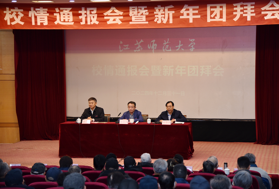 祥龍回首留勝景,金蛇起舞賀新程。2024年12月31日上午,校離退休教職工校情通報會暨新年團拜會在泉山校區敬文報告廳舉行。校黨委書記芮國強,校黨委副書記、校長杜增吉,校黨委副書記蔡國春,校關心下一代工作委員會委員單位主要負責人出席會議;省管離退休干部代表,離退休黨委委員、支部委員和黨員代表,校關工委老同志委員及職能組負責人代表,校老年協會負責人,具有高級職稱的離退休教職工及黨外人士代表,離退休工作部(處)全體工作人員兩百余人歡聚一堂,共賀新年。蔡國春主持會議。
